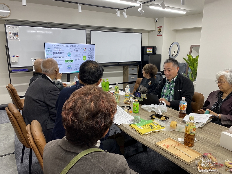 交流会では、「地域の自然を守るタオル®」(ECOひいきプロジェクト)でおなじみの太平電機の樋口公平社長より、ハンカチタオル販売に至った背景や、現在取り組んでいる希少動物のロードキル対策のためのセンサーシステム設置の取り組みについて紹介していただきました。