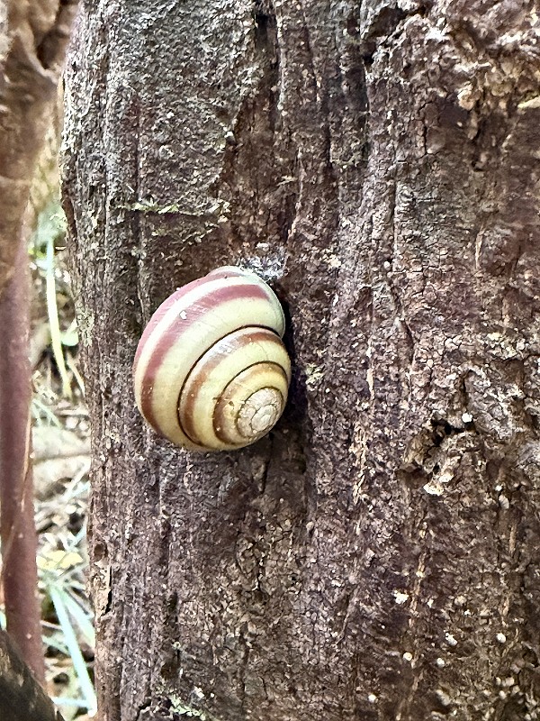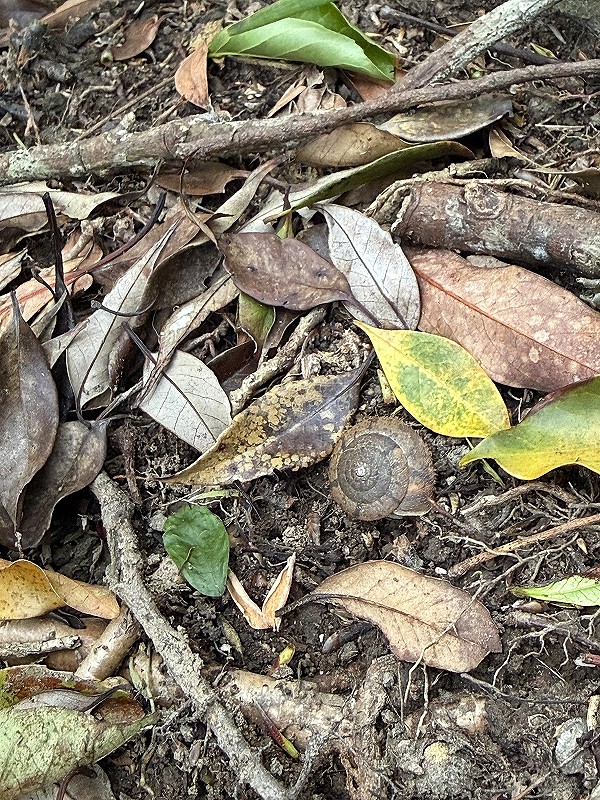 視線が低い子どもたちは、生き物を見つけるのがとても上手で、葉っぱの裏や枯葉に埋もれたカタツムリを見つけては報告してくれ、みんなで観察を楽しみました。